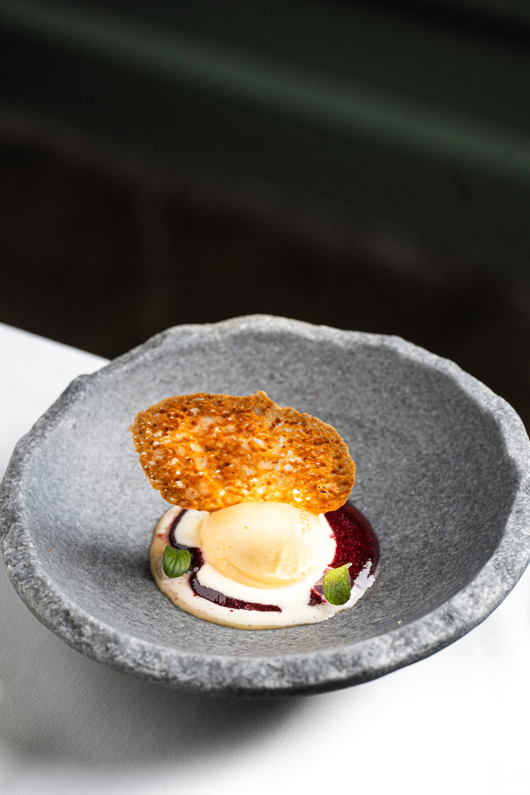 Se eligió el perfume favorito de Lola Flores, Abril de Victorio y Lucchino. Su aroma inspira un refrescante coulis de frutos rojos con mora, arándano, todo ello reducido con vino de Jerez y una galleta de remolacha con toque crujiente. Además se añade un sorbete de mandarina. También se dio a los asistentes un cartón perfumado con los ingredientes de los platos. Todo ello se acompañó de un cóctel elaborado con brandy de Cardenal Mendoza.