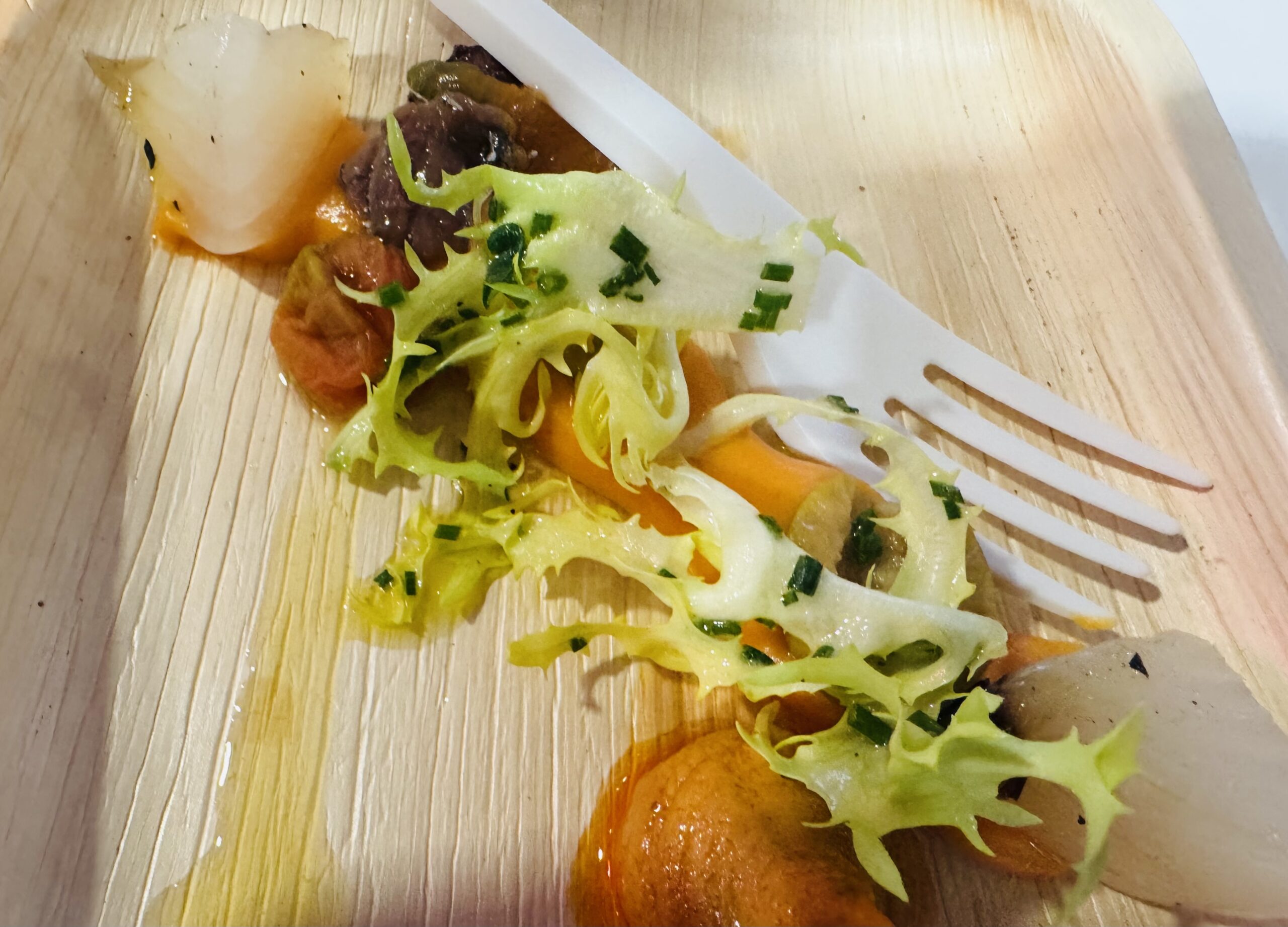 Para poner de manifiesto su salinidad y frescura Tonino Valiente lo acompañó de una ensalada de escarola y cebolla de fuentes. Una apuesta arriesgada, porque no siempre es fácil armonizar vino y vegetales.