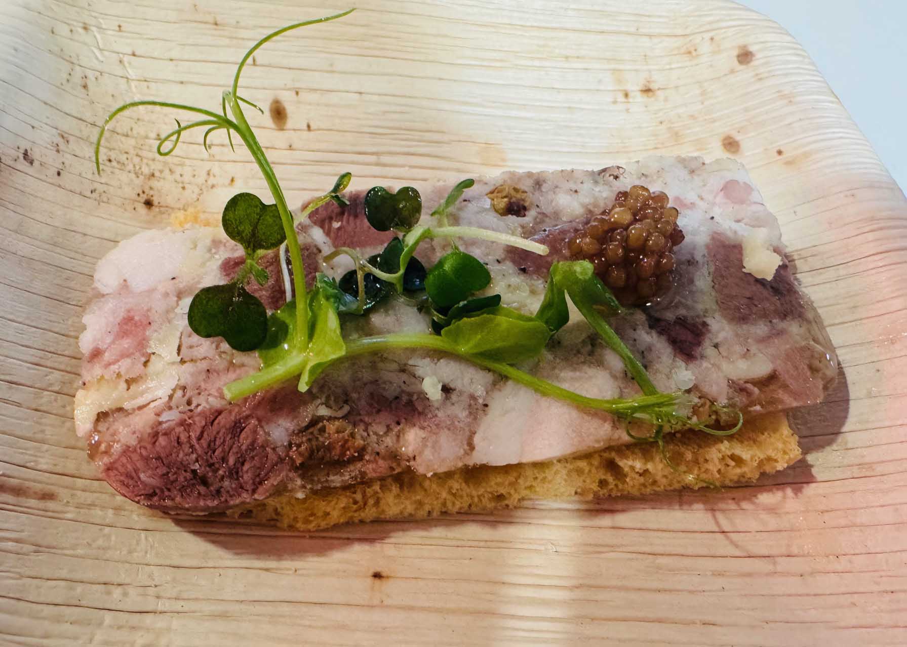 El trabajo de Tonino Valiente fue fundamental en el desarrollo de la cata. El chef de Tatau presentó sus platos a lo largo del recorrido. En declaraciones a Yummy Bull, Valiente considera que “el menú nació con una idea clara: poner la gastronomía al servicio de las garnachas. En coordinación con Fernando Mora, y con total libertad creativa, diseñamos una secuencia de pases a partir del carácter y los matices de cada vino, buscando acompañarlos y realzarlos”. “La elección de producto aragonés con identidad, como la trucha del Pirineo, la trufa, el ternasco o la cebolla de Fuentes, respondió a esa misma lógica de respeto y equilibrio. Más que un ejercicio técnico, fue un proceso sensorial y de escucha, orientado a construir un menú coherente, delicado y profundamente ligado al territorio”.